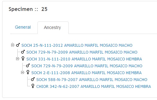 Each specimen also will accumulate information from their descendants and, therefore, the descendants will accumulate information about their ancestry. My-Breeding.com display this information from the detail of the specimen or ancestry tree.